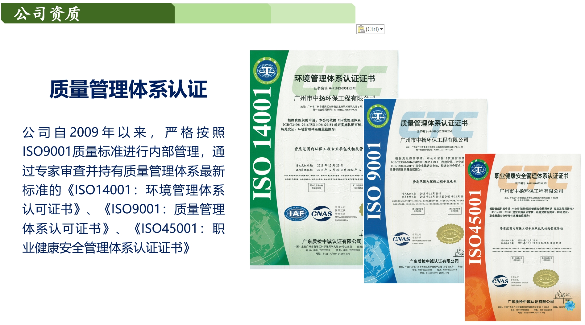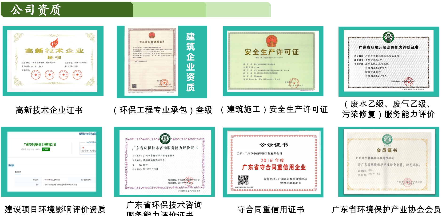 公司是高新技術(shù)企業(yè),擁有廣州市建設(shè)委員會頒發(fā)的建筑企業(yè)資質(zhì)證書(環(huán)保工程專業(yè)承包二級),安全生產(chǎn)許可證,ISO900:2000質(zhì)量管理體系認(rèn)證證書,ISO14001環(huán)境管理體系認(rèn)證證書,廣東省環(huán)境污染治理資格行業(yè)認(rèn)定證書(廢氣、廢水、污染修復(fù)),廣東 省環(huán)保技術(shù)咨詢服務(wù)能力評價證書,環(huán)評資質(zhì)證書等在專業(yè)資質(zhì)。